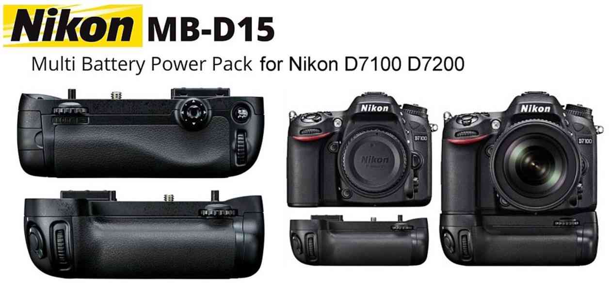 Bateriový grip Nikon MB-D15 prodlužuje autonomní dobu provozu fotoaparátu. Zlepšuje také ergonomii při fotografování na výšku - je vybaven tlačítkem spouště a příkazovými voliči. Bateriový grip Nikon MB-D15 prodlužuje autonomní dobu provozu fotoaparátu. Zlepšuje také ergonomii při fotografování na výšku - je vybaven tlačítkem spouště a příkazovými voliči. K napájení Battery gripu slouží určené baterie EN-EL15 a Ni-MH nebo lithiové tužkové baterie.