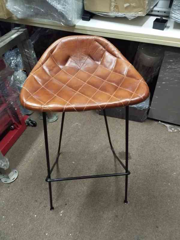 Hnědý koženkový sedák s prošíváním, černé kovové nohy, stabilní konstrukce.
