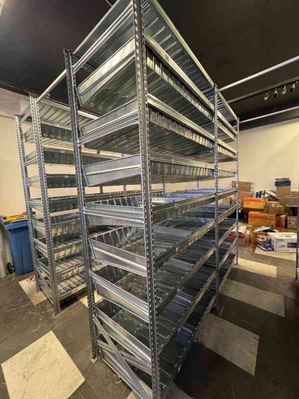 Prodám 3 použité regály SUPER123 firmy Regalsistem s vanovými policemi (perfektní pro drobné zboží).