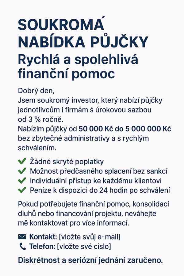 Dobrý den, abych vám pomohl překonat různé finanční starosti a bez problémů čelit vašim budoucím cílům, předkládám nabídku půjček lidem v nesnázích nebo těm, kteří jim chtějí pomoci vyřešit některé ze svých finančních problémů nebo dokonce začít podnikat. Nabízím půjčky od 20 000 do 550 000 000 Kč s dobou splácení od 1 roku do 30 let s flexibilní úrokovou sazbou 2 % ročně. Pro více informací o mé nabídce mi prosím napište nebo mě kontaktujte na: