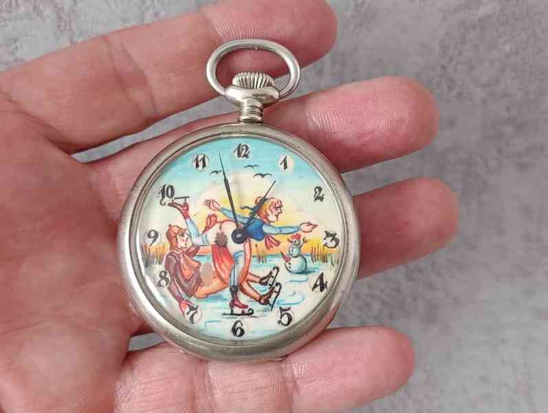 Starožitné kapesní hodinky značky REVUE s repasovaným ciferníkem (erotický motiv).