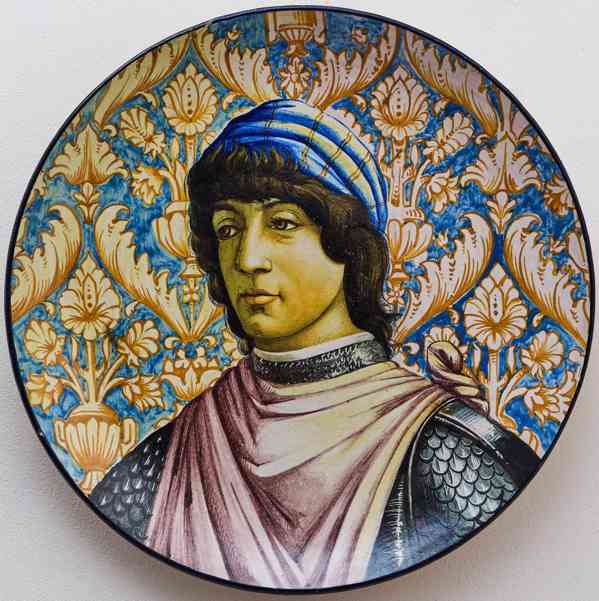 Velký ručně malovaný italský talíř s portrétem mladého muže podle fresky z dílny Sandra Botticelliho. Na zadní straně nápis „Da un affresco esistente in Roma nella Cappella Sistina, Storia di Mosè (A. Filippi detto Botticelli)“, který odkazuje na inspiraci freskami v Sixtinské kapli v Římě.