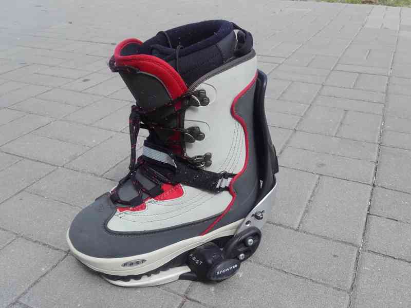 Prodám velmi komfortní, jako nové, boty + NÁŠLAPNÉ vázání na snowboard zn.SNOW PRO, velikost 38 (UK5). Při nástupu stačí opravdu jen stoupnout, jako do lyž. vázání. Při výstupu není nutno si sedat na sníh, jen zatáhnout za páčku!! Nevhodná koupě-úraz s dlouhodobým léčením....