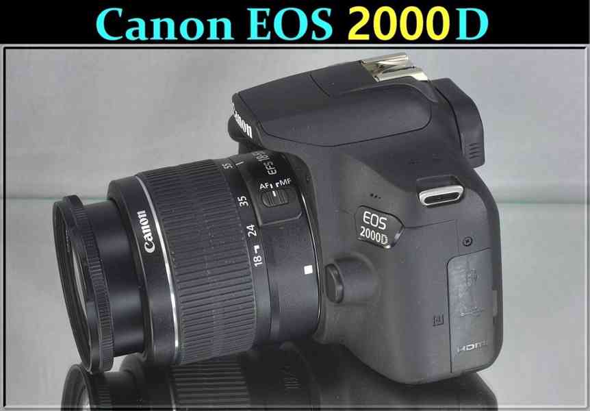 Canon EOS 2000D je vybaven snímačem CMOS typu APS-C s rozlišením 24,1 megapixelů, obrazovým procesorem DIGIC4+, Rozsah hodnot citlivosti ISO 100 až 6 400 (horní hranici lze rozšířit až na 12 800), Filmy v rozlišení Full HD / 1080p se snímkovací frekvencí 30 snímků za sekundu, Režim Video Snapshot, kontinuální snímání rychlostí 3 snímky za sekundu,9bodové automatické zaostřování, LCD displej (TFT) s úhlopříčkou 7,5 cm (3 palce) a 920 tisíci body, Vestavěný průvodce funkcemi a nastaveními, Automatický inteligentní scénický režim, Kreativní filtry, Wi-Fi konektivita a podpora funkce NFC.