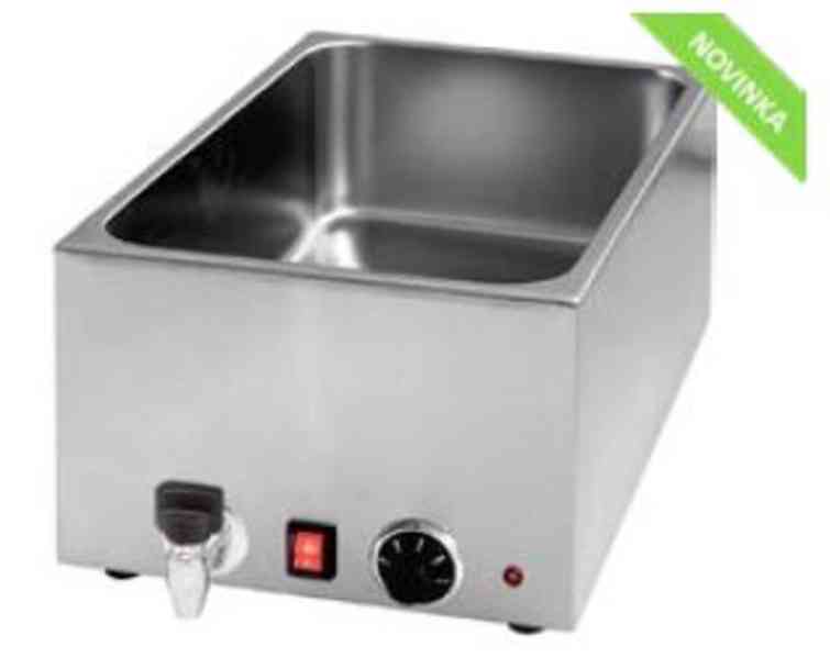 Bain-Marie EKO, výpustný kohout, teplá vana – pro kombinaci gastro nádob 1/1. Hloubka vany 200 mm, teplotní rozsah 0 – 90°C, rozměr ŠxHxV: 340 x 590 x 280 mm, výkon 1,2 kW, přípojka 230 V, cena bez GN, GN sleva 15%. Cena 5.090,- Kč + doprava. (kód: S741205)