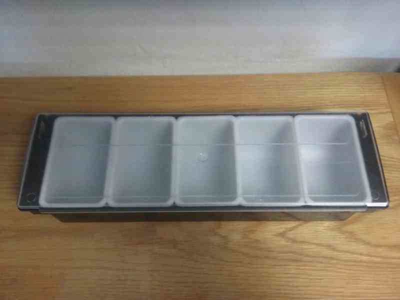 Uzavíratelný plastový box s průhledným krytem a 5 samostatnými nádobkami. Vhodné na dekorační přísady: citrón, olivy, sůl, koření, zdobení atd. Vhodné do baru, cukrárny, restaurace, kuchyně, domácnosti, venkovní posezení, atd. Rozměr DxŠxH: 500 x 160 x 90 mm. Cena: 550,- Kč vč. DPH a doprava. (kód: S473500)