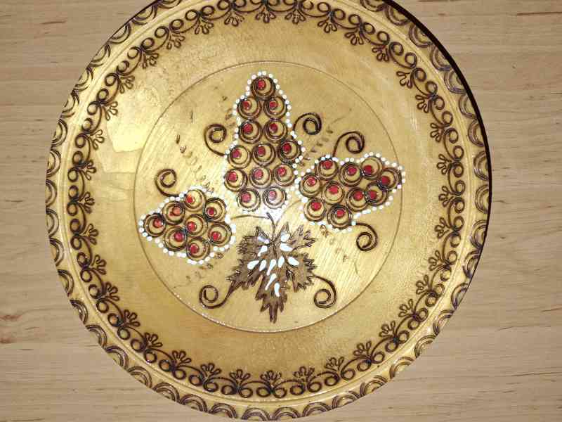 Dřevěná vyřezávaná a nádherně malovaná miska s lidovým vzorem hroznů vína. Horní průměr 21 cm.
