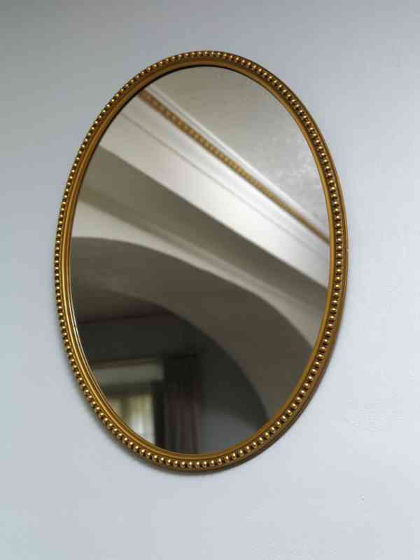Elegantní oválné nástěnné zrcadlo v jemně zlaceném rámu s plastickým perlovcem po obvodu. Rám je štíhlý, proporčně velmi vyvážený a působí lehkým, kultivovaným dojmem, typickým pro klasicistní a raně empírové formy, které byly oblíbené i v pozdějších historizujících interiérech.