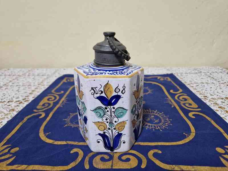 Krásná velmi stará malovaná keramická šestihranná nádoba, cínová montáž, s datací 1668. Zřejmě se jedná o pozdější kopii, přesné stáří nedokážu určit.