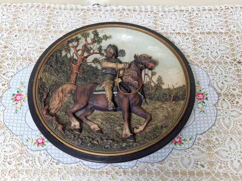 Luxusní obří figurální Talíř s Vojákem na koni, keramika siderolit, precizní zpracování, špičková kvalita - Johann Maresch, 3 třetina 19st.