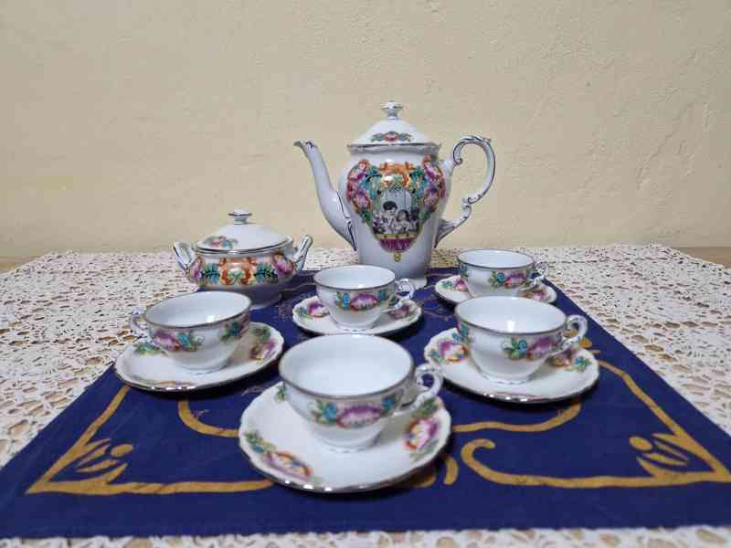 Luxusní kávový servis pro 5 osob, precizní ruční malba - vše značeno, Jihočeské malovánky, V. podhrázský, 1940.