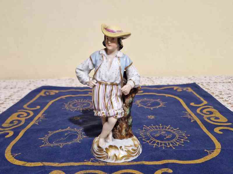 Vzácná porcelánová soška, kavalír, bohatě malováno a zlaceno, zachovalost je vysoká, pravděpodobně dobře restaurováná levá ruka a asi část klobouku, ostatní perfektní - Praha, značeno P, kolem pol. 19 stol.