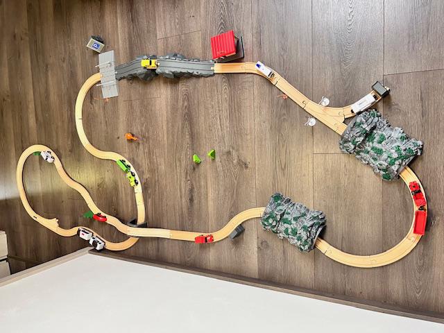 Prodám rozšířenou dřevěnou vláčkodráhu, včetně vláčků, mostů, tunelů a doplňků -viz. obrázek