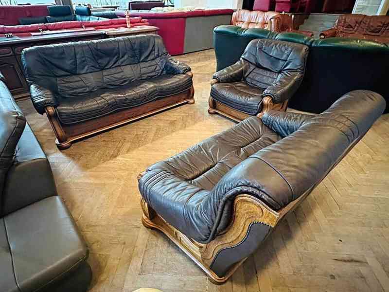 Pravá kůže v kombinaci s ozdobným frézovaným dřevem - tvrdé dřevo - masiv. Vhodná i k umístění do prostoru - vzadu a z boku kůže/látka s ozdobnými čalounickými cvočky (hřeby). Barva tmavě hnědá. Vysoká sedačka. Pravá kůže.