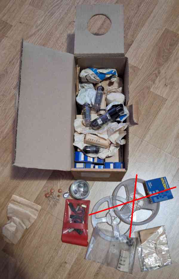Elektronky a další součástky asi převážně pro opravy retro magnetofonů a rádií. Již prodáno: 4x kotouče s nahrávacím drátem (pro drátofon), 3x zaváděcí magnetofonové pásky (šířka 6,35 mm) a 2x plastové navíječe magnetofonové pásky (šířka pro pásku 8,7 mm) - vše prodané je na fotkách červeně přeškrtnuto nebo označeno v seznamu součástek jako "PRODÁNO". Funkčnost u většiny součástek nemám jak otestovat, ale vše bylo pečlivě zabaleno často i v originálních obalech bez viditelného poškození/opotřebení. Počty a typy většiny součástek lze vidět na doplněných fotkách a seznamech. Cena dohodou (nabídněte) - "množstevní" slevu můžeme vždy dojednat (zejména vezmete-li většinu/vše v inzerátu).