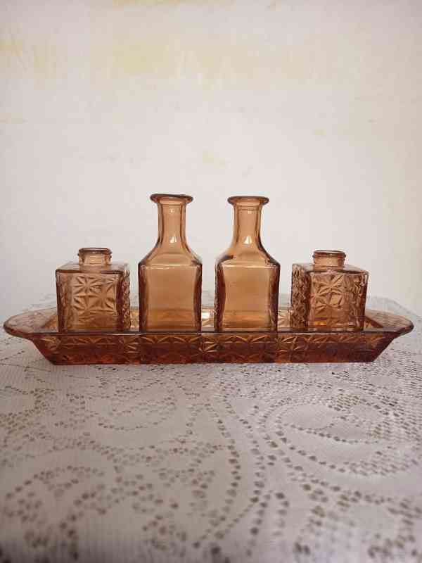 Prodám sadu krásných skleněných dóziček, 2 menší výška 5 cm, 2 větší výška 10 cm, tácek délka 26 cm