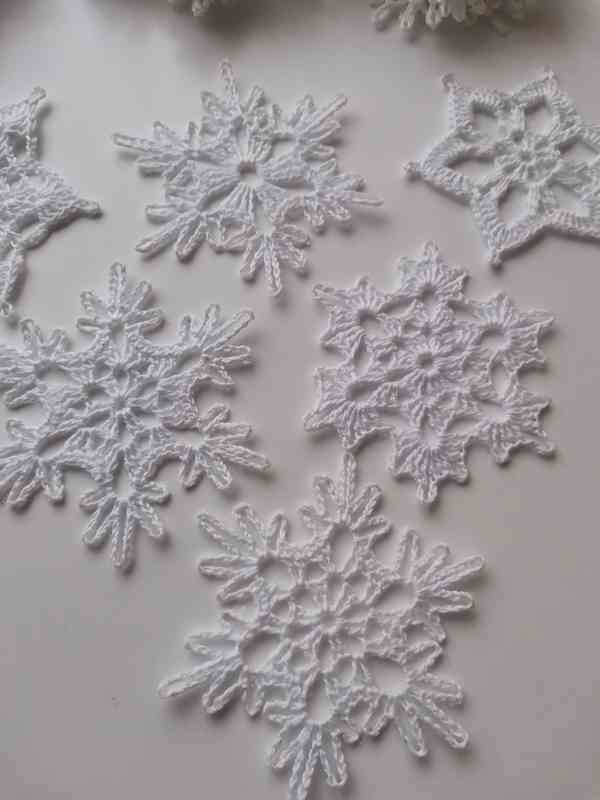 Háčkované a vypnuté škrobem sněhobílé vločky na vánoční stromeček, výzdobu oken a pro jiné dekorace. Celkem 10 kusů.