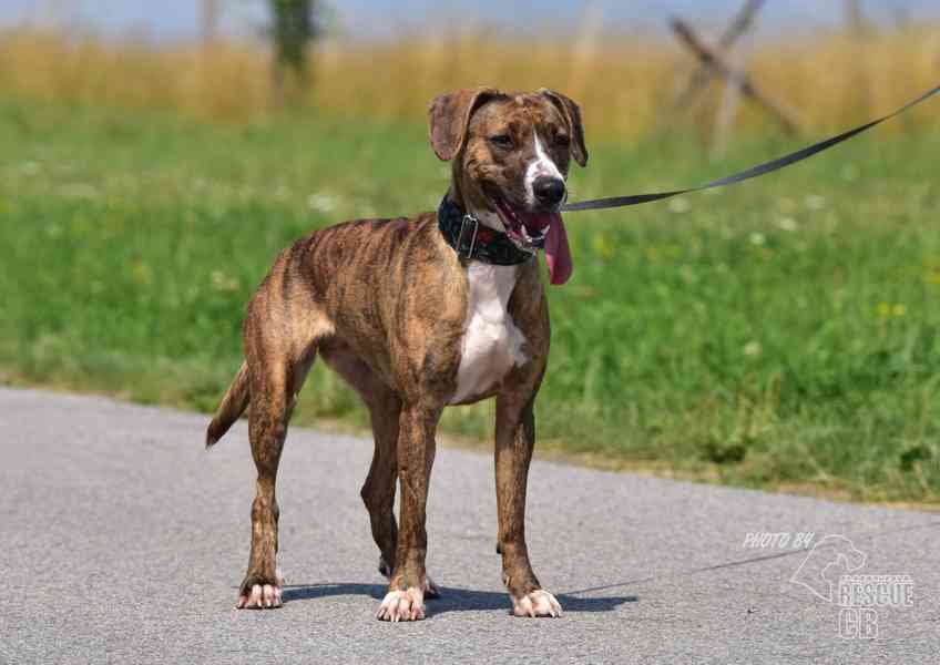 Rok stará fena, temperamentní, učenlivá, ke známým lidem milá, celkově velmi aktivní, trochu hysterka. Nevhodná k malým dětem a jiným zvířatům. Ošetřená proti parazitům, označená mikročipem, vakcinovaná. Tel.: 777214680