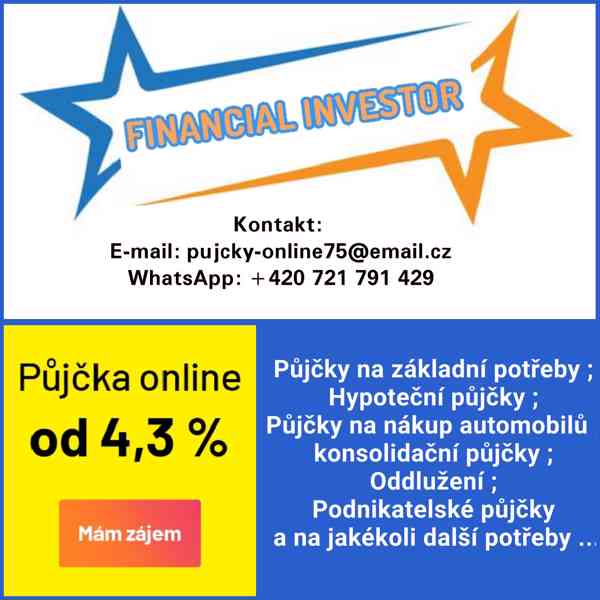Konsolidační půjčka: až 1 500 000 Kč. Půjčit si můžete i na jiné účely. Naše nabídky půjček vám poskytnou okamžitou spokojenost a reagují na váš požadavek. Ať už jde o nebankovní půjčku nebo bankovní půjčku. Musíte nás kontaktovat, pokud jste v nouzi.