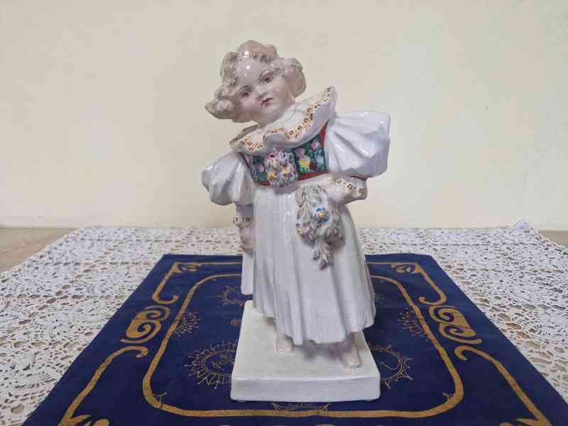 Hezká keramická barevně malovaná Soška, Dívka v kroji, Bechyně, M. Kocourek, 1 pol. 20 stol.