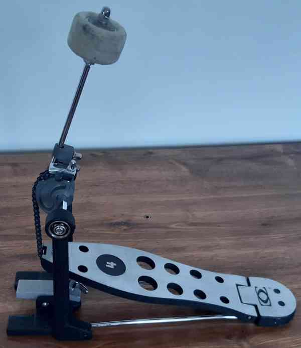Single pedál s jednořadým řetězem a pevnou základnou, postranní zajištění šroubem, dvoustranný beater, nastavitelná tuhost pružiny. Velmi málo hraný. Pořizovací cena byla 2.190 Kč. Cena jen 999 Kč. tel. 797 864 944 email: patmatvm@email.cz