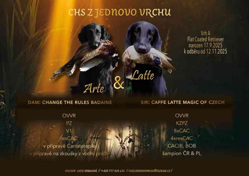 Z úžasného spojení Arte a Latteho, se narodilo krásných 9 štěňátek, někteří už své rodinky mají a černí kluci stále čekají. Rodiče mají zdravotní testy v naprostém pořádku. Jsou lovecky vedení a mamka se připravuje na canisterapeutické zkoušky. Štěňátka jsou řádně očkována, odčervená a čipována. K odběru jsou ihned. Pro více informací mě kontaktujte na emailu nebo tel.