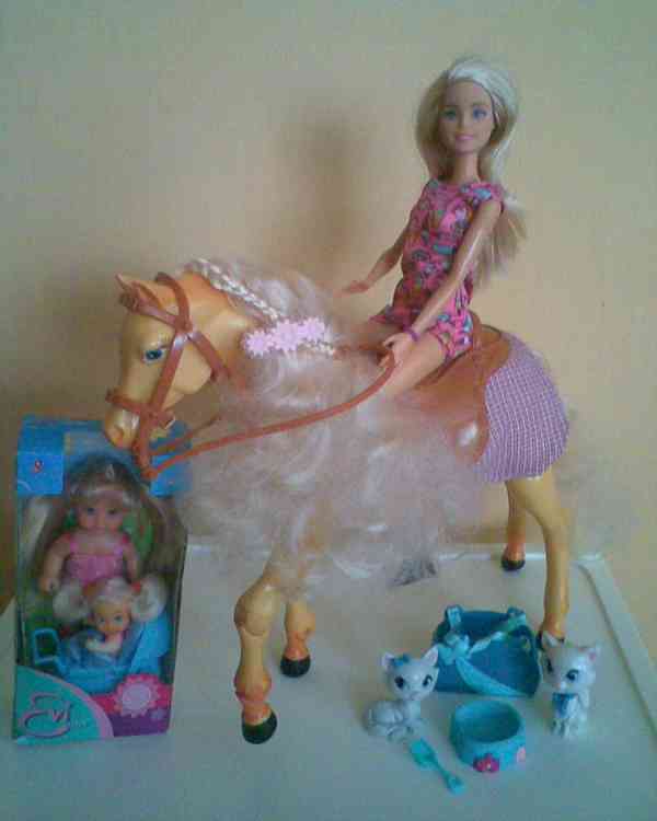 Barbie, Ken (vyberte si bud blond nebo tmavého), dvě různé Evičky, kočárek s panenkou, kočičky, pejsci, chodící koník, postele, rozkládací sedačka, krb, akvárium, papoušek, květinový stojan, malířská sada, televize, Vánoční stromeček, stůl a židle, nádobíčko, možno zdarma Vánočně zabalit