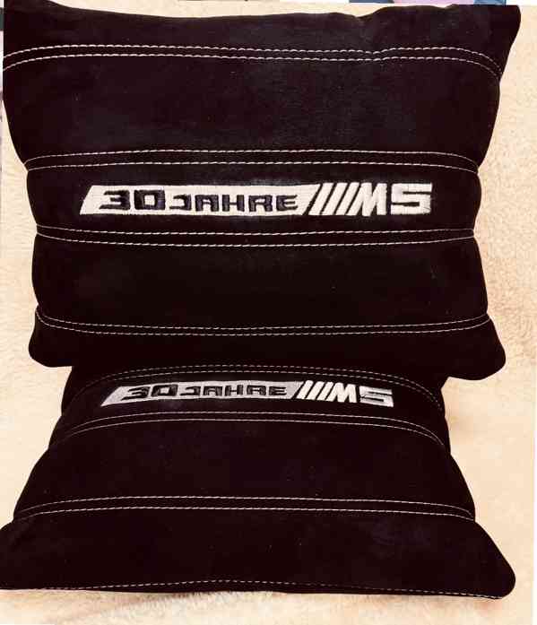 Prodám nové dekorační kožené, alcantara, polštářky do auta BMW, zakazková výroba. Barva černá se stříbrnou vyšivkou.