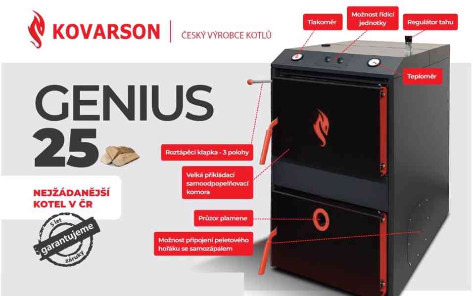 Prodám kotel od společnosti KOVARSON GENIUS 25kW. Díky své jedinečné konstrukci splňuje požadavky každého zákazníka, který vytápí svůj dům tuhými palivy. Kotel disponuje ideálními rozměry a je vhodný do každé kotelny. Topení dřevem je nejekologičtější a nejdostupnější zdroj energie. Topení dřevem je a bude vždy nejlevnější.