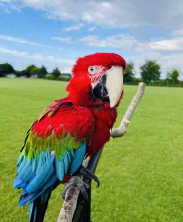 Tento krásný ara je ručně odchovaný, socializovaný a plný osobnosti. Zdravý, veterinářsky zkontrolovaný a dodává se s doklady. Ideální pro rodiny nebo jednotlivce, kteří hledají barevného a inteligentního společníka.