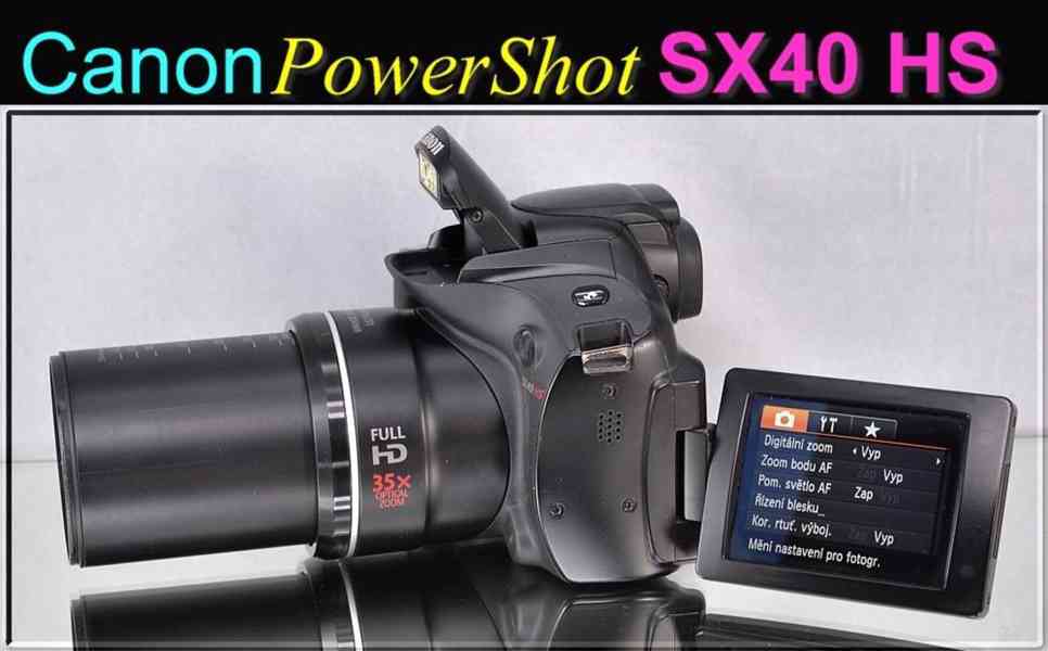Digitální fotoaparát Canon PowerShot SX40 HS má 35× ultraširokoúhlý optický zoom s motorem USM. Systém HS System (12,1 megapixelu) s procesorem DIGIC 5. Displej LCD s variabilním úhlem natočení a úhlopříčkou 6,8 cm (2,7"), elektronický hledáček. Image Stabilizer (s rozsahem 4,5 EV) Inteligentní IS. Filmy v rozlišení Full HD (1080p) rychlostí 24 snímků/s se stereofonním zvukem.