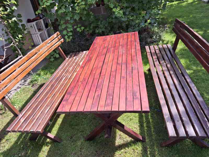 Prodám zahradní stůl a 2 lavice, dřevo bříza, rozměry stolu 80 cm x 200cm.