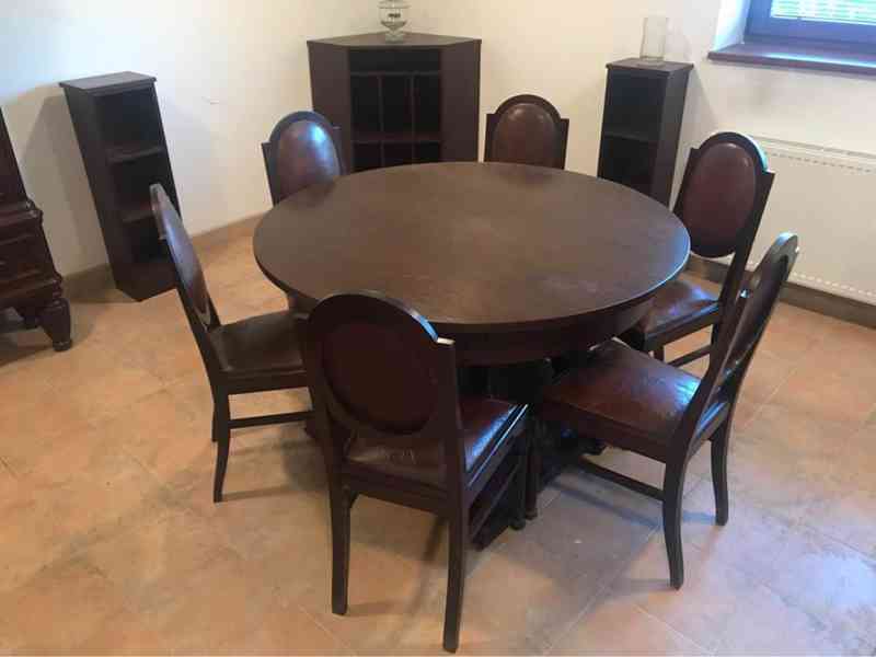 Krásná robustní starožitná sestava v zachovalém stavu! Jídelní kulatý rozkládatelný stůl + 6x kožené židle, komoda, komoda se sklem, stolek a dvě kožená křesla, komody/poličky - 2x + 1x rohová. Více info, fotek, videa apod. na e-mailu. Děkujeme.