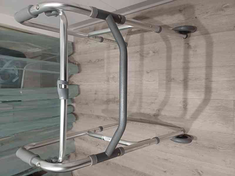 Prodam dvoukolové chodítko, rám hliníkový, skládací, jednoduché výškové nastavení a skládaní, plná kola, protiskluzové nástavce