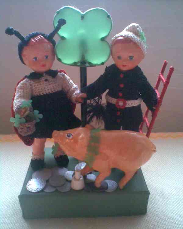 Beruška s kominíčkem a prasátkem pro štěstí čtyřlístek svítí, panenka s deštníkem na krabičce s bižuterií, Andílek a panenky