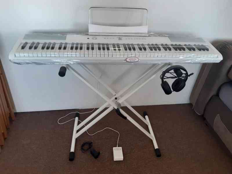 Plnohodnotný digitální klavír s vyváženou klaviaturou 88 kláves. Notový pultík, bílý stojan a bílý Sustain pedal pro prodloužení zvuku včetně orig. síťového el. adaptéru. Vestavěné stereo reproduktory a výstup pro sluchátka pro tiché hraní. Stereo výstupy RCA a MIDI, USB připojení. Můžete hrát osmi různými vysoce kvalitními zvuky. Pokud hledáte nádherný zvuk klavíru, cembala nebo vibes, vibrafonu, SDP-2 to všechno zvládne. Jako bonus je v ceně profes. igelitový protiprašný obal na gumu který stojí kolem 600 Kč. 100% stav. Hrané pouze doma žákem LŠU. Cena za vše pouze 6.399 Kč. tel. 797 864 944 email:patmatvm@email.cz