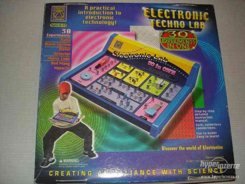 Rarita z roku 2002: Od společnosti Creative Toys: Electronic Lab 30 in ONE. Pokusná elektrolaboratoř. Včetně spojovacího materiálu, schémat a anglického návodu (občas jsou tam vepsané i české překlady :) - vše viz foto. 800kč