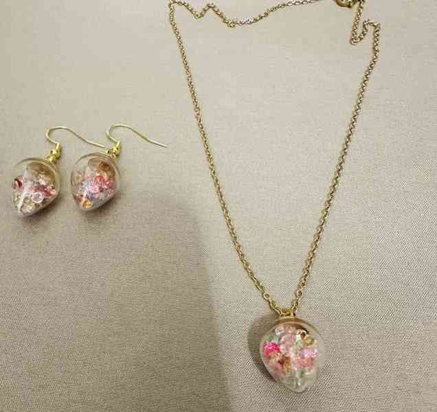 Jemná a kouzelná sada, která se skládá z náušnic a přívěsku ve tvaru malé lampy z čirého skla. Uvnitř se třpytí kamínky, které vytvářejí efekt magického lesku.