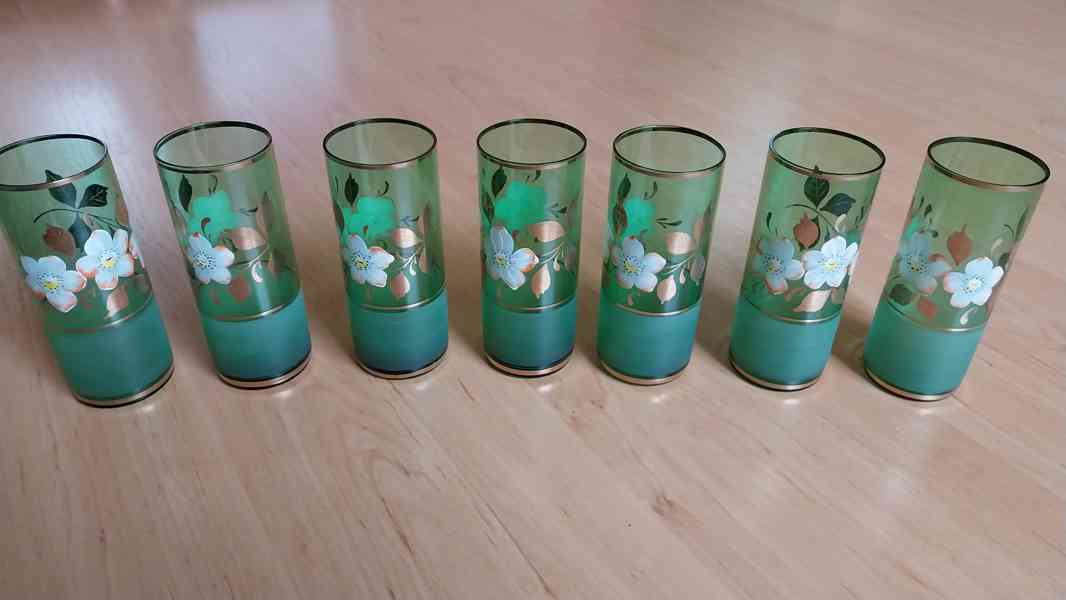 Nabízím 7dílnou soupravu ručně malovaného zeleného skla s motivem bílých a zlatých květů, výška 14 cm, průměr 5 cm. Velmi krásný dárek.