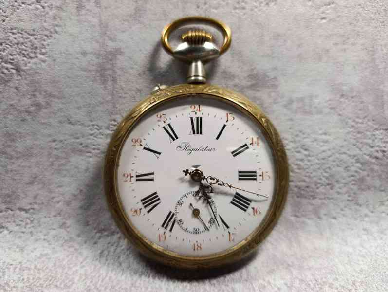 Velké dvouplášťové kapesní hodinky Régulatéur s romantickou tématikou na zadní části