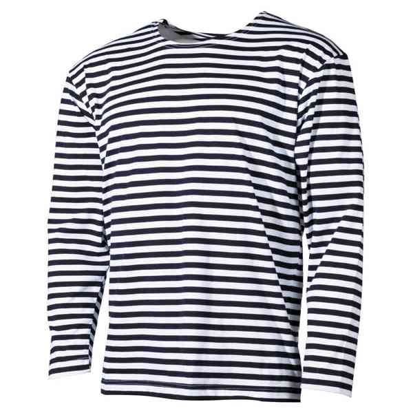 Ruské námořnické triko s dlouhým rukávem navy-bílé (tmavá námořní modrá, skoro až do černa), vhodné na léto. Od německé značky MFH.