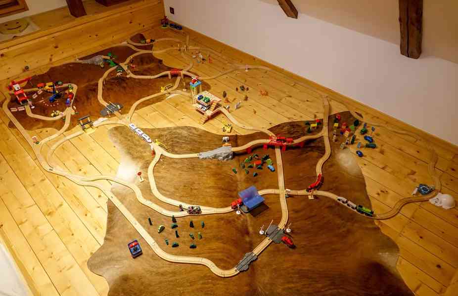 Prodám dřevěné vláčkodráhy. Jedná se o zhruba 8 sad, které je možno vzájemně kombinovat. Vedle mostů, domečků, jeřábu, svatyně, zastávky, iglú, parkovacího domu a dalších dekorací obsahuje i mnoho postav, zvířat, vlaků, autobusů, aut apod. Tři vláčky jsou na baterie, jeden na dálkové ovládání. Vše je v bezvadném stavu. Cena za vše z přiložených fotografií (+ taška dalších kolejnic a výhybek) pouze 3990,-!