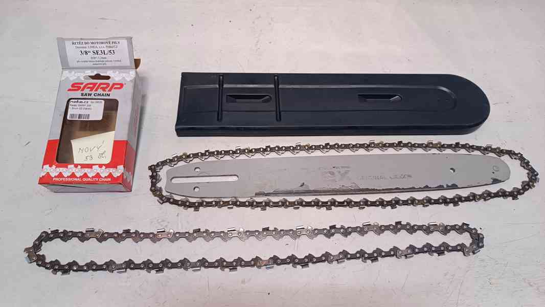Prodám vodící lištu Narex GB-EPR 350 mm za 190,- Kč, nový řetěz SARP SE3L/53, 1,3 mm, 3/8“, 53 článků za 190,- Kč a stejný řetěz 1 x broušený za 140,- Kč. Vše za 450,- Kč.