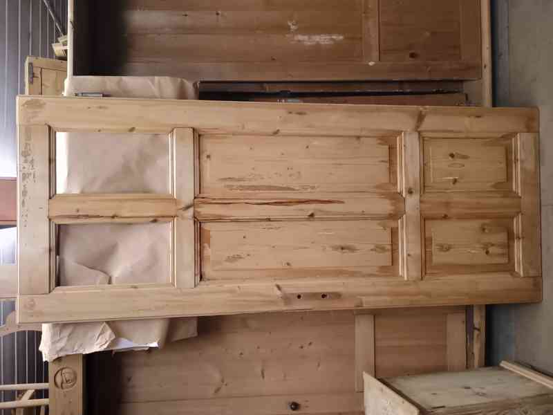 staré smrkové pravé vnitřní dveře, louhované, zbaveno škůdců, před renovací, na třech pantech, 2 x sklo tabulka 41 x 24, rozměry: 200 x 80 cm, vhodné na chalupu, penzion, pro info volat 603210073