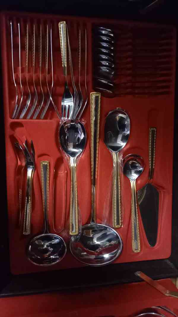 Dobrý den, nabízím jídelní set, viz foto, k slavnostním příležitostem. Nový, nepoškozený, krásný. Má svou časovost. Děkuji.