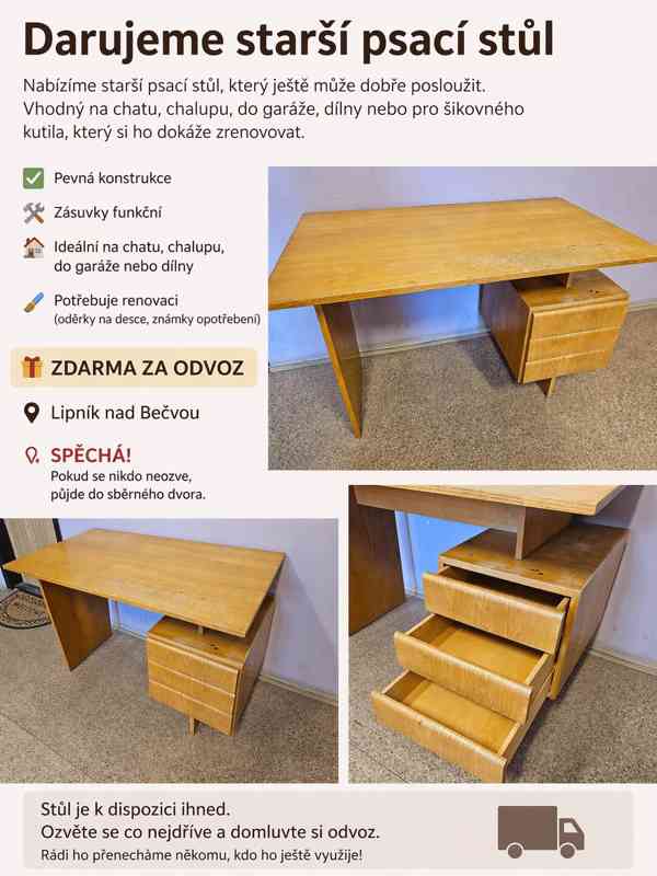 Nabízím starší psací stůl vhodný na chatu, chalupu, do garáže nebo pro šikovného kutila k renovaci.