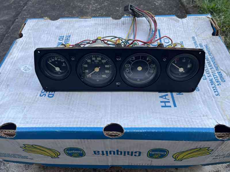 Prodám na ŠKODA 105 + 120 + 125 přístrojovku - kulaté budíky, včetně propojovací kabeláže. Štít bez prasklin a ulomených částí, neoriginální palivoměr. Zachovalý nálezový stav bez poškození dle fotek v inzerátu, cena 500.-Kč. Osobní vyzvednutí Praha 5 nebo předání po dohodě. Odeslání možné po platbě předem t:776*064*641