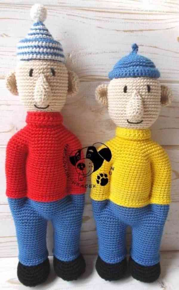 Háčkovaný Pat a Mat, na výšku mají 34 a 36 cm. CENA JE ZA OBĚ POSTAVIČKY. Háčkovaní jsou z materiálu určeného pro děti do 3 let.