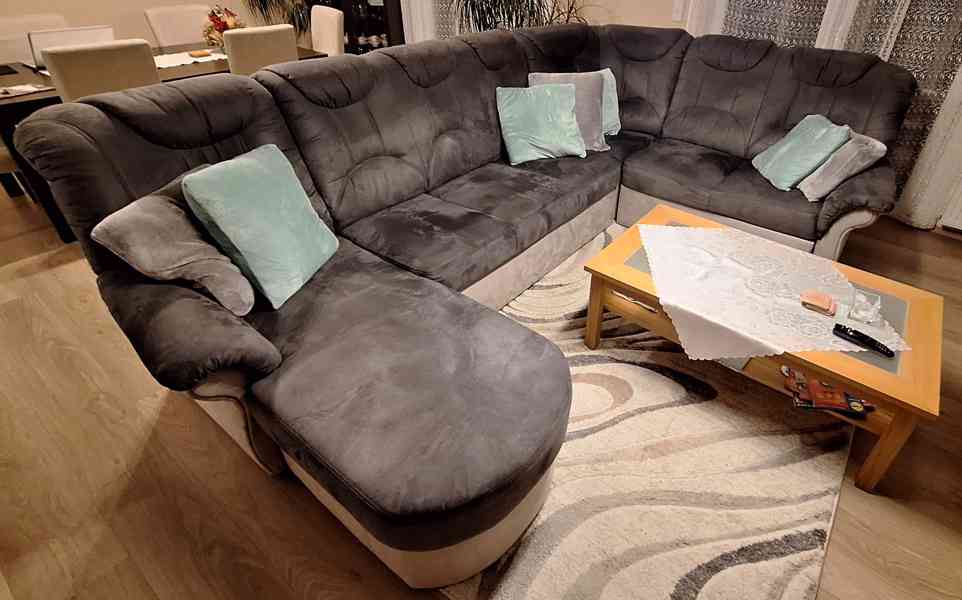 Nabízím sedací soupravu do "U", rozkládací s lůžkem a úložným prostorem. Má opotřebený potah. Na kratší části je poškozený sedák.