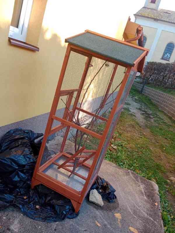 Prodám krásnou dřevěnou voliéru pro ptactvo či savce. Má výsuvný šuplík, oddělovací stříšku, přední dvířka a žebříček. Má výsuvný šuplík, je tak dobře udržovatelná. Byla v ní kdysi krátkou dobu vakoveverka létavá. Od té doby nepoužívaná. Doprava je na kupujícím, nejlépe odvést takto v poskládaném stavu. Dá se však rozmontovat.